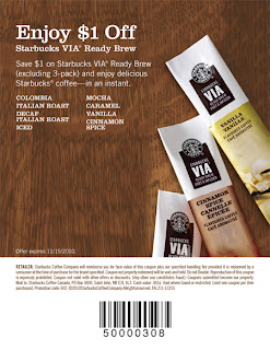 Enjoy $1 Off Starbucks VIA Ready Brew. Save $1 on Starbucks VIA Ready Brew (excluding 3-pack) and enjoy delicious Starbucks coffee - in an instant.