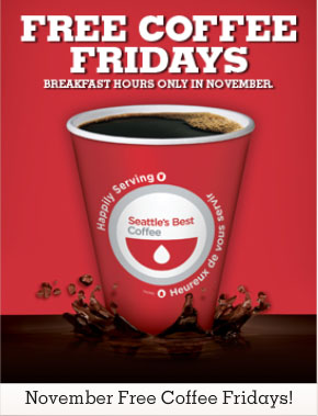 Get One Free 12 oz hot Seattle’s Best Coffee per customer per visit during breakfast hours. Valid only November 5, 12, 19, 26 2010 at participating restaurants in Canada. You don’t need a coupon or need to buy anything else to take advantage of this deal.