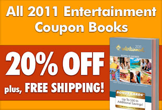 All Entertainment 2011 Coupon Books are currently on sale. Get 20% Off and Free Shipping. This is a limited time offer. From your hometown to your next vacation destination, there's an Entertainment book packed with discounts that'll save you hundreds!