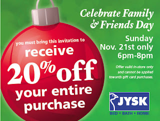 JYSK Family and Friends Day is this Sunday, November 21, 2010 from 6-8pm. This is an extremely limited 2 hour only sale where you will receive 20% Off your entire in-store purchase. In order to take advantage of this deal, you will need to print and bring the invitation coupon below.