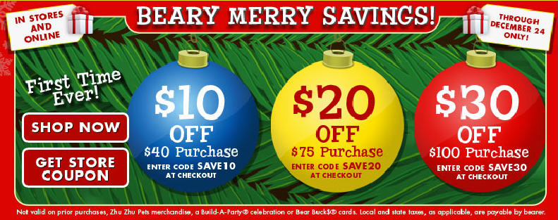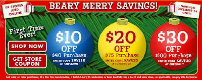 Build a Bear Workshop has a couple decent coupons that are valid now and until December 24, 2010. You can save $10 Off on a $40 purchase, $20 Off on a $75 purchase or up to $30 Off on a $100 purchase.