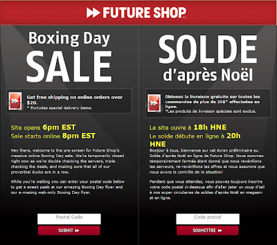 It's that time of the year again. Boxing day madness is only a couple days away (Sunday, December 26, 2010). Future Shop will start their Boxing Day Online sale at 8pm EST tonight (Friday, December 24, 2010). Future Shop and Best Buy's website are both closed. They will allow you to start browsing both sites at 6pm EST and the sales will start at 8pm EST.