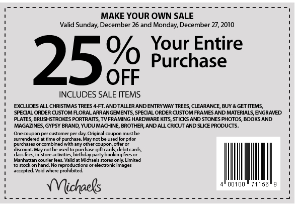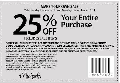 Michael's has a pretty good 25% Off Your entire purchase Boxing Day Coupon. The coupon can only be used on December 26-27, 2010. The coupon even includes sales items.