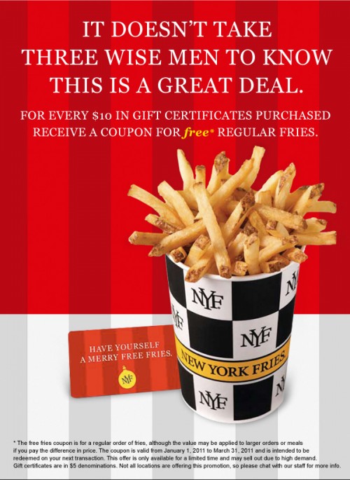 For every $10 New York Fries gift certificates purchased, receive a coupon for FREE regular fries. The coupon is then valid from January 1, 2011 to March 31, 2011. This is a limited time offer and at participating stores. I love NY Fries and will be taking advantage of this deal.