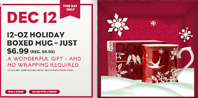 Today only (December 12, 2010), as part of Starbucks "12 Days of Sharing" promotion, you can get a 12-oz Holiday Boxed Mug for only $6.99. It normally retails for $9.95. It would make a wonderful gift - and no wrapping required. Quantities are limited and valid at participating stores.