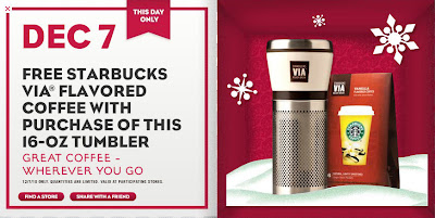 Today only (December 7, 2010), as part of Starbucks "12 Days of Sharing" promotion, you can get a Free Starbucks VIA Flavored Coffee with purchase of this 16-OZ Tumbler so you can enjoy great coffee wherever you go. Quantities are limited and valid at participating stores.