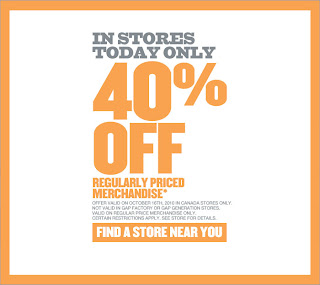 In stores today only (October 16th, 2010), get 40% Off regular priced merchandise! The offer is valid on October 16th, 2010 in Canada stores only. Not valid in Gap Factory or Gap Generation stores.