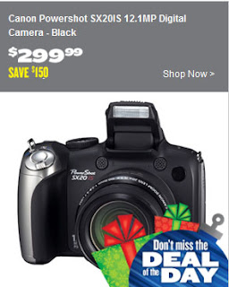 Today's Best Buy "Deal of the Day" (Wednesday, November 17, 2010) is the Canon Powershot SX20IS 12.1MP Digital Camera - Black for $299.99. It normally retails for $449.99 which is a savings of $150. This is a 1 day only sale so don't miss out.