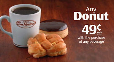 For a limited time, visit your local Tim Hortons and get any Donut for only $0.49 when you buy a fresh cup of coffee or any beverage. There is a one donut per beverage purchase limit at participating restaurants in Canada.