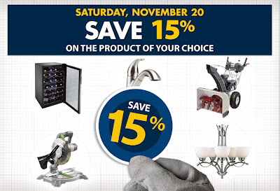 Consumers will save 15% on one product of their choice per transaction, per person, per day. Limit of 15 units of the same product (same product code). Discount applies Saturday, November 20, 2010, on all in-stock merchandise available in store only. Special orders, the purchase of RONA gift cards, layaways and services offered in store, such as installation, delivery, rentals, cut shop services, etc., are not eligible for this promotion. Limited quantities on certain products. Discount applicable before taxes. Only “Cash and Carry” purchases paid by cash, debit or major credit cards are eligible. This offer is invalid on contractor or house accounts. This offer cannot be combined with any other offer, but applies to products already on sale in the flyer. Offer available at participating stores. Certain conditions apply. Details in store.