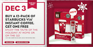 Today only (December 3, 2010), as part of Starbucks "12 Days of Sharing" promotion, Buy a 12-Pack of Starbucks VIA Instant-Coffee, Get another 12-Pack Free. Enjoy the taste of the holidays at home or on the go. This is an awesome deal if you like their instant coffee. Quantities are limited and valid at participating stores.