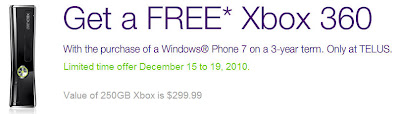 HOT DEAL: Telus Mobility- Get a Free Xbox 360 when you Buy a Windows 7 Phone (Until Dec 19)