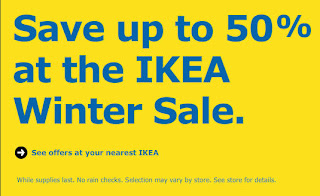 I was just checking out IKEA's website and noticed they have a Save up to 50% Off Winter Sale. There's a big yellow banner about it on the main page. There's around a dozen or so exclusive sale items per store and some very good deals. This is a limited time offer sale and while supplies last. All sales are final - no returns or exchanges.