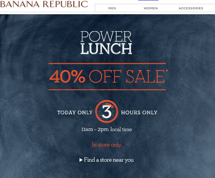 Banana Republic just sent me an email about their extremely limited Power Lunch 3-Hours only sale. During the sale, you'll get 40% Off! The sale is today (December 21, 2010) from 11am - 2pm local time. This is an in-store only sale.