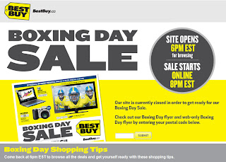 Just like Future Shop, Best Buy's Boxing Day sale will start on Friday, December 24, 2010 at 8pm EST. Best Buy and both Futureshop's website are currently closed. You can start browsing both sites at 6pm EST and the sales will start at 8pm EST.