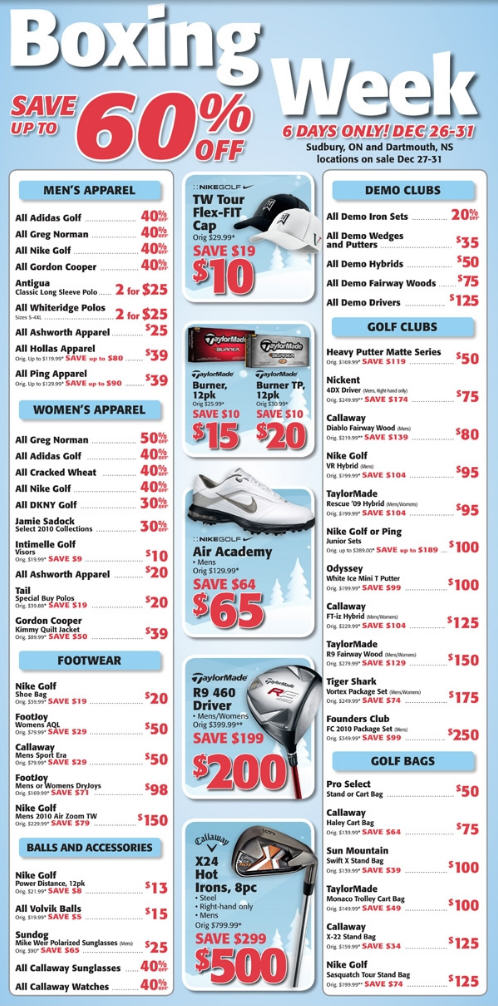 Golf Town just leaked their Boxing Week Sales Flyer to their LeaderBoard Members. Because I'm a member, I just saved the image so I can share it with all of you. This is a 6-Day only sale from December 26-31, 2010.