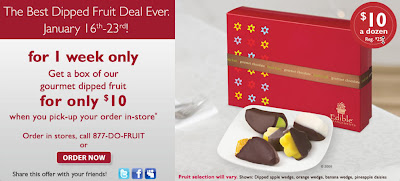 PROMOTION DETAILS: This offer is valid January 16-23 only. Fruit selection varies and includes any of the following: bananas, oranges, apples and pineapple. Orders may be placed online, in stores or by calling 877-DO-FRUIT. Customers may order online or by calling 877-DO-FRUIT. Orders placed during promotion period must be picked up in stores no later than Wednesday, January 26, 2011. $10 dipped fruit boxes must be picked up at a local store and are not eligible for delivery or shipping. To view our store locations, please click here. Cannot be combined with any other offer, promotion, coupon or coupon code. This promotion is not valid on previous purchases. Offer expires 1/23/2011 at 11:59 EST. Offer valid at participating locations only. While supplies last.