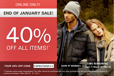 Esprit Canada has a 'End of January' sale where you can save 40% Off All Items! The sale is available online only from now until January 31, 2011. Enter the discount promo code "ESPRITSAVE11" at checkout to get the discount.