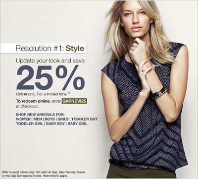 Gap Canada just sent me an email about this sale. From now until January 5, 2011, save 25% off everything when you shop Gap online. Simply enter the discount promo code “GAPNEW25” at checkout to get the discount.