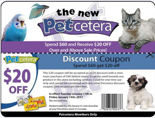 Petcetera just released a nice discount coupon where you can get $20 Off if you spend $60 or more. The coupon is available from Tuesday, January 11th to Friday, January 14th, 2011. The coupon is available for Petcetera Members only, but it's free and you can just sign up for the membership when you checkout at the store. The coupon used to be $20 Off when you spend $50 or more. It looks like they just increased it to $60, but it's still a pretty good deal.