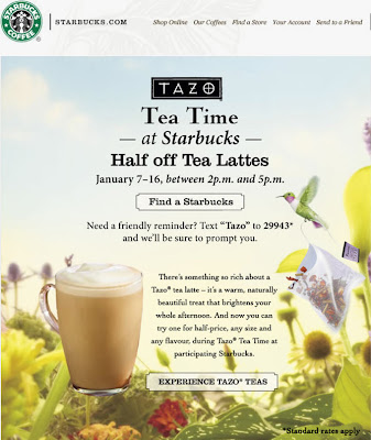 From January 7-16, 2011 between 2pm and 5pm, get Half Off Tazo Tea Lattes at Starbucks! This deal is available across all Starbucks in Canada. I saw this deal posted on their Canadian Facebook Page.