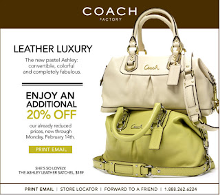 Coach Factory Stores has a new coupon just in time for Valentine's Day. From now until Monday, February 14, 2011, print the coupon below and enjoy an additional 20% off on their already reduced prices.