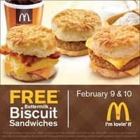Mcdonalds nationwide will be giving out these free biscuits sandwiches from February 9th-10th, 2011 during breakfast hours only.