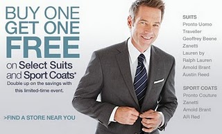 Moores Canada currently has a promotion where you can Buy One, Get One Free on select Suite and Sport Coats. The sale goes until March 6, 2011. Once you're at the store, I read online that they also have a Buy One, Get One Free on select dress pants and a Buy One, Get One 50% Off on select dress shirts.