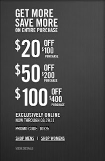 From now until March 29, 2011, receive $20 off on a $100 purchase, $50 off on a $200 purchase or $100 off on a $400 purchase at Abercrombie & Fitch. This offer is valid online only. Enter the promo code “10325″ at checkout to get the discount. Some restrictions apply.