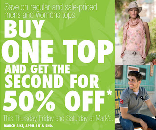 Between March 31 to April 2, 2011, visit your nearest Mark’s Work Wearhouse store to check out their buy one, get the second 50% off offer. This offer applies to all men’s and women’s regular and sale priced tops. Some conditions apply.