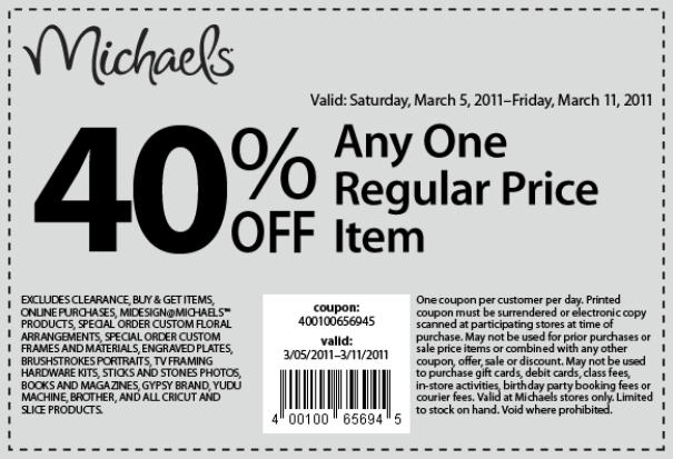 The second coupon is for 40% off any one regular price item and is valid from Saturday, March 5 - Friday, March 11, 2011)