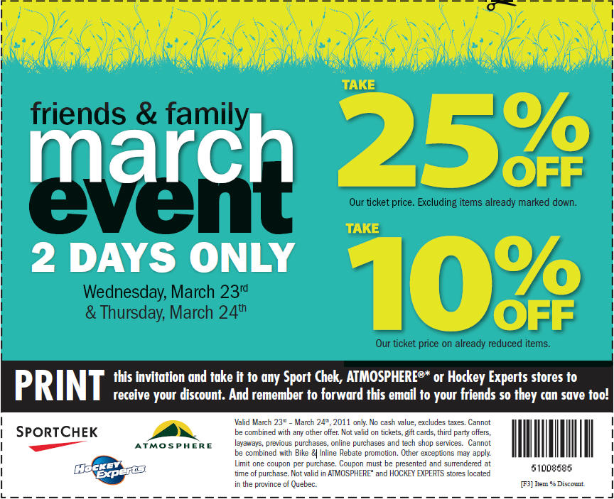 Sport Chek, Hockey Experts & Atmosphere Friends & Family Sale is back for 2 days only this Wednesday, March 23 - Thursday, March 24, 2011. During the sale, you can take 25% off regular priced items or 10% off sale items.