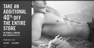 Until April 25, 2011 Abercrombie & Fitch is offering an additional 40% off the entire store. This offer is valid in-store and online at Abercrombie.com. For online purchases the discount will be applied at checkout. Just use the promo code 14223. Purchase quantities may be limited. Other restrictions may apply.