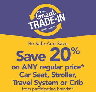 Babies R Us is having their Great Trade-In Event from now until May 15, 2011. During the Be Safe and Save promotion, you can save 20% off on any regular priced car seat, stroller, ravel system or crib from participating brands,when you trade in your old and used car seat, stroller or crib from any brand.