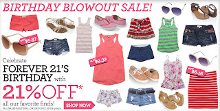 Shop online and get 21% off on select merchandise as Forever 21 celebrates its' birthday. All sales are final. This offer is valid until April 24, 2011.