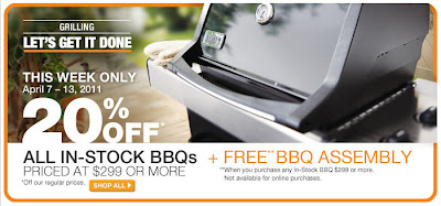 The Home Depot is offering 20% off on your purchase of all in-stock BBQs priced at $299 or more, and a free BBQ assembly. This offer is valid from now until April 13, 2011 and applies in-stores only.