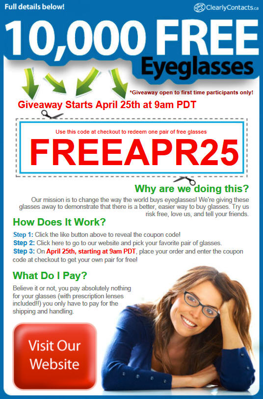 ClearlyContacts.ca has another incredible giveaway. This time, they will be giving away 10,000 pair of free eyeglasses on Monday, April 25 starting at 9am PDT! Simply be one of the 1st 10,000 people to order a pair of glasses and enter the promo code "FREEAPR25" at checkout.
