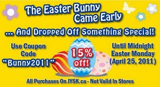 JYSK is offering 15% off your online purchase from now until April 25, 2011. Simply use the promo code BUNNY2011 at checkout to receive the discount. This promotion does not apply in-store.