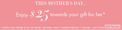 To celebrate Mother's Day, Le Chateau is offering $25 off on your purchase of $100 or more. This offer is valid until May 8, 2011.