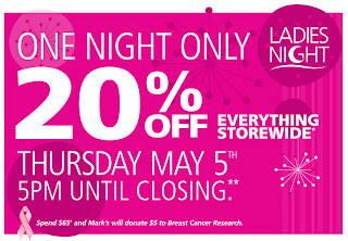 Head over to Mark's Work Wearhouse on Thursday, May 5, 2011, from 5 pm to closing, for Ladies Night. Receive 20% off everything in-store. This includes regular priced and sale items. When you spend $65 or more, Mark's will donate $5 to breast cancer research. Some additional restrictions apply.