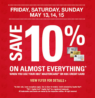 Shop at a Zellers store today, Saturday and Sunday (May 13-15, 2011) and receive 10% off on almost everything when you use your HBC credit card or HBC mastercard. Some exemptions apply. Please see in-store for details.