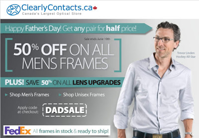 Clearly Contacts currently has a very good sale that goes until this Sunday, June 19, 2011. You can get 50% off all Mens Frames during their Father's Day sale when you enter the discount promo code" DADSALE". The promo code will even get you 50% off on all Len's upgrades as well.