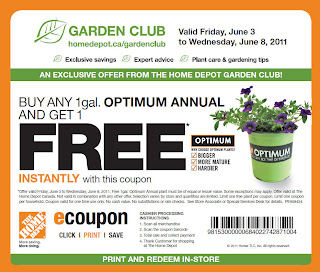 Start your garden project now by visiting your nearest The Home Depot store. They are offering a printable coupon for a buy any one gallon optimum annual, get one free from now until June 8, 2011. There is a limit of one coupon per customer.