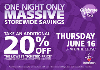 Mark's Work Wearhouse is having a one night storewide sale on June 16, 2011, from 5 pm until closing. You save 20% off on regular and sale priced merchandise and no minimum purchase is required. This offer applies in-stores only.