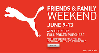 Shop at Puma online until Monday, June 13, 2011 and save 40% off on your entire online order. Simply enter the promotion code PUMAFRIENDS at checkout to receive the discount. Some additional restrictions apply. Plus, standard shipping is free and is automatically applied with orders of $85 or more.