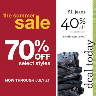 Gap Factory stores are having a huge Summer Sale where you can save 70% off on select styles. Also, check out their jean's section because all jeans are 40% off. This offer excludes clearance items. Both offers are valid until July 21, 2011. Some additional conditions apply.