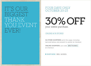 Here’s a coupon that will save you 30% off your entire purchase at Banana Republic! The coupon is valid until Sunday, October 23, 2011 and works in-stores and online.