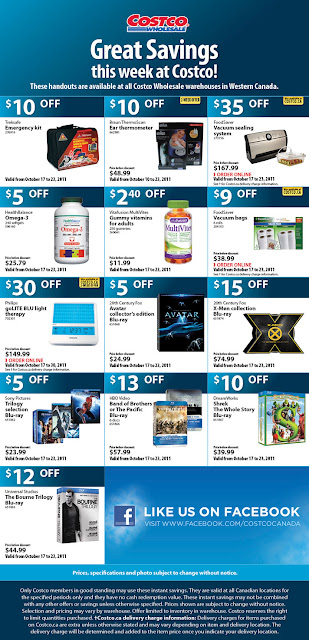 Here is Costco’s latest weekly instant savings coupons. The coupons are valid from October 17 - October 23, 2011. These handouts are available at all Costco Wholesale warehouses in Western Canada. Only Costco members in good standing may use these instant savings.