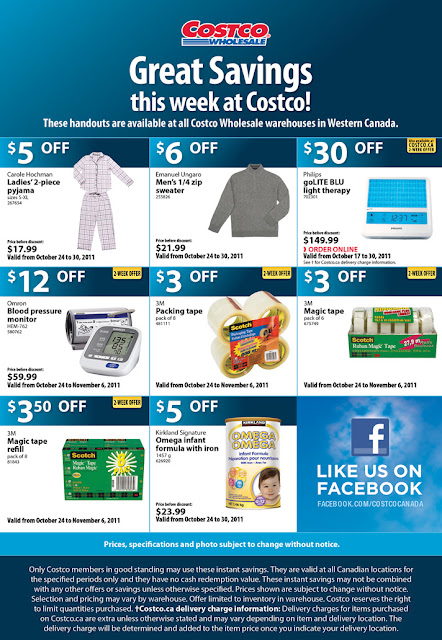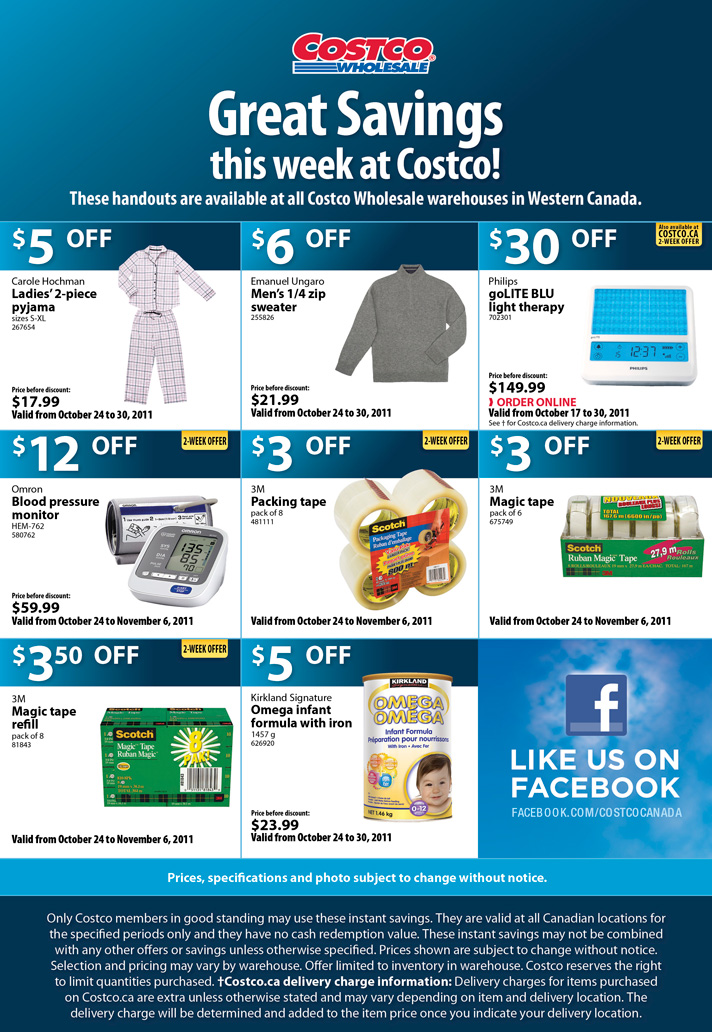 Here is Costco’s latest weekly instant savings coupons. The coupons are valid from October 24 - October 30, 2011. These handouts are available at all Costco Wholesale warehouses in Western Canada. Only Costco members in good standing may use these instant savings.