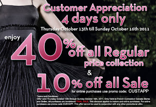 French Connection has a Customer Appreciation Sale that ends today (Sunday, October 16, 2011). During the sale, you’ll save 40% off all regular priced items and 10% off all sale items.